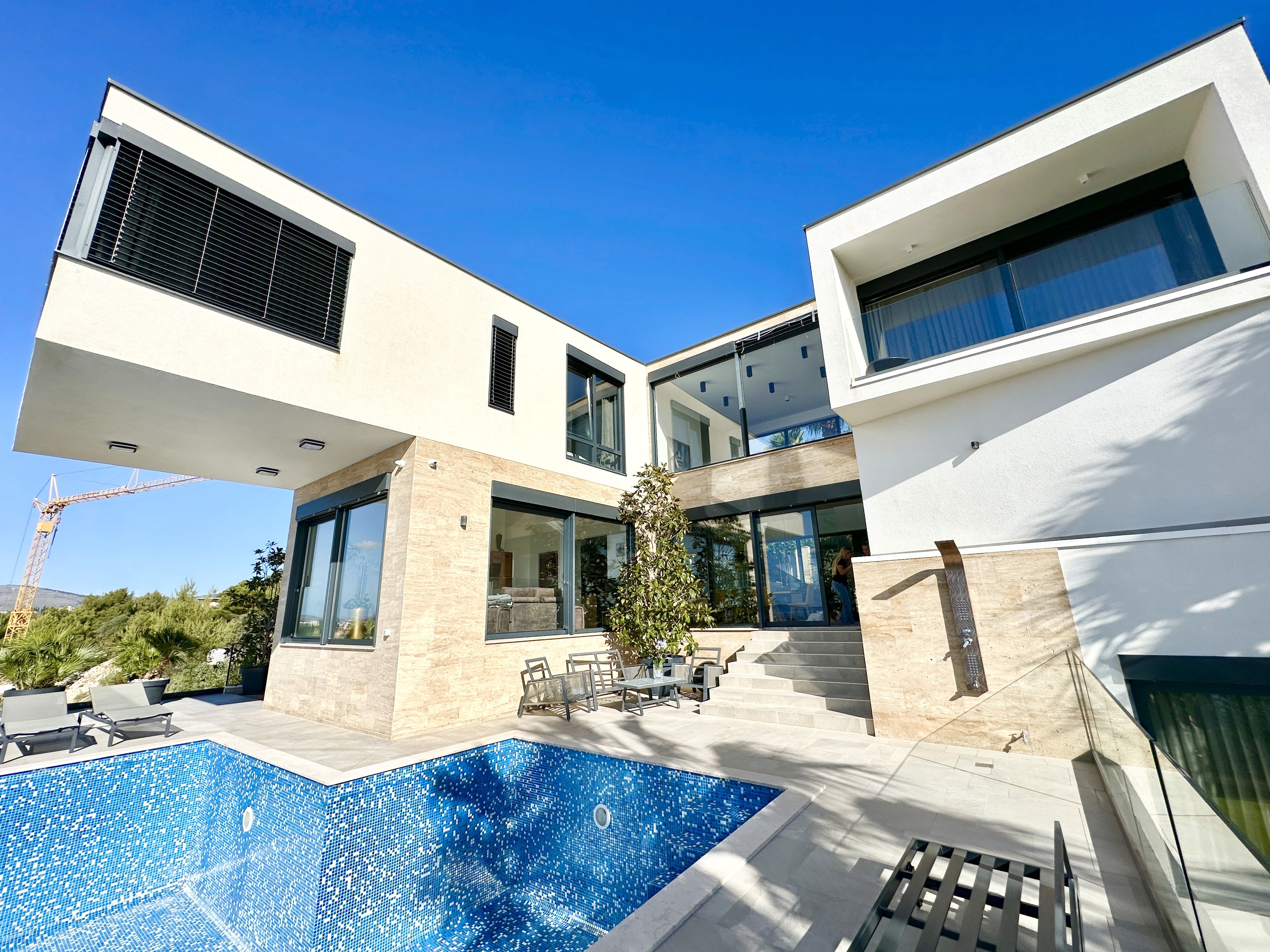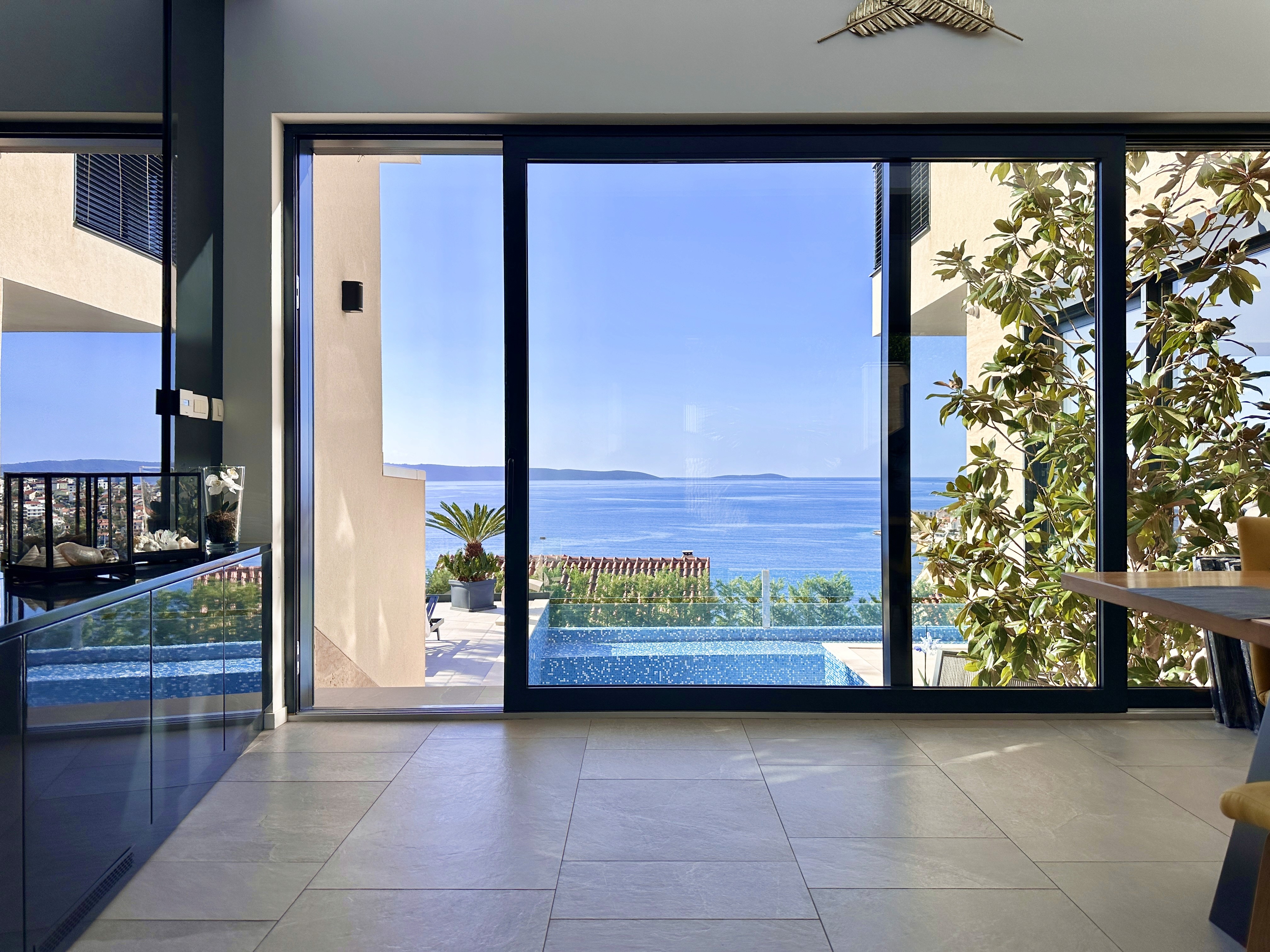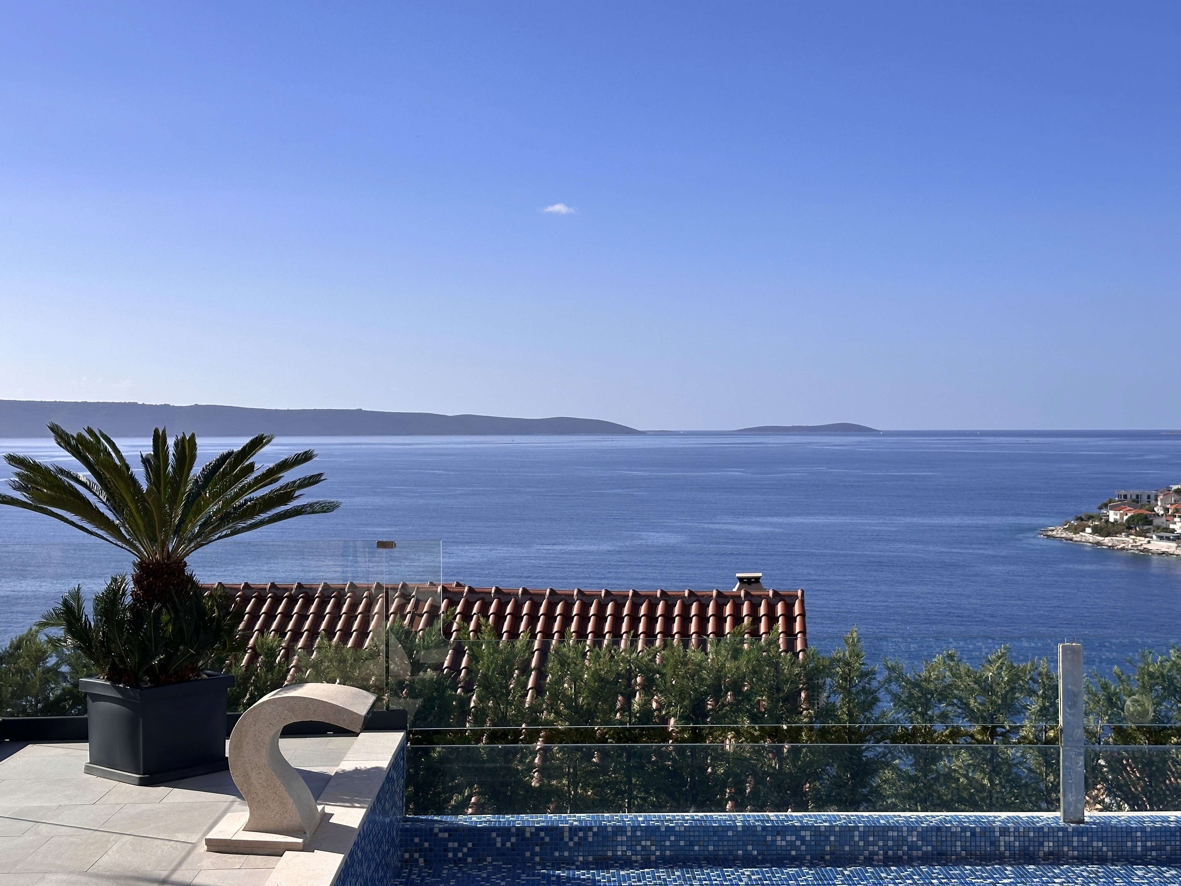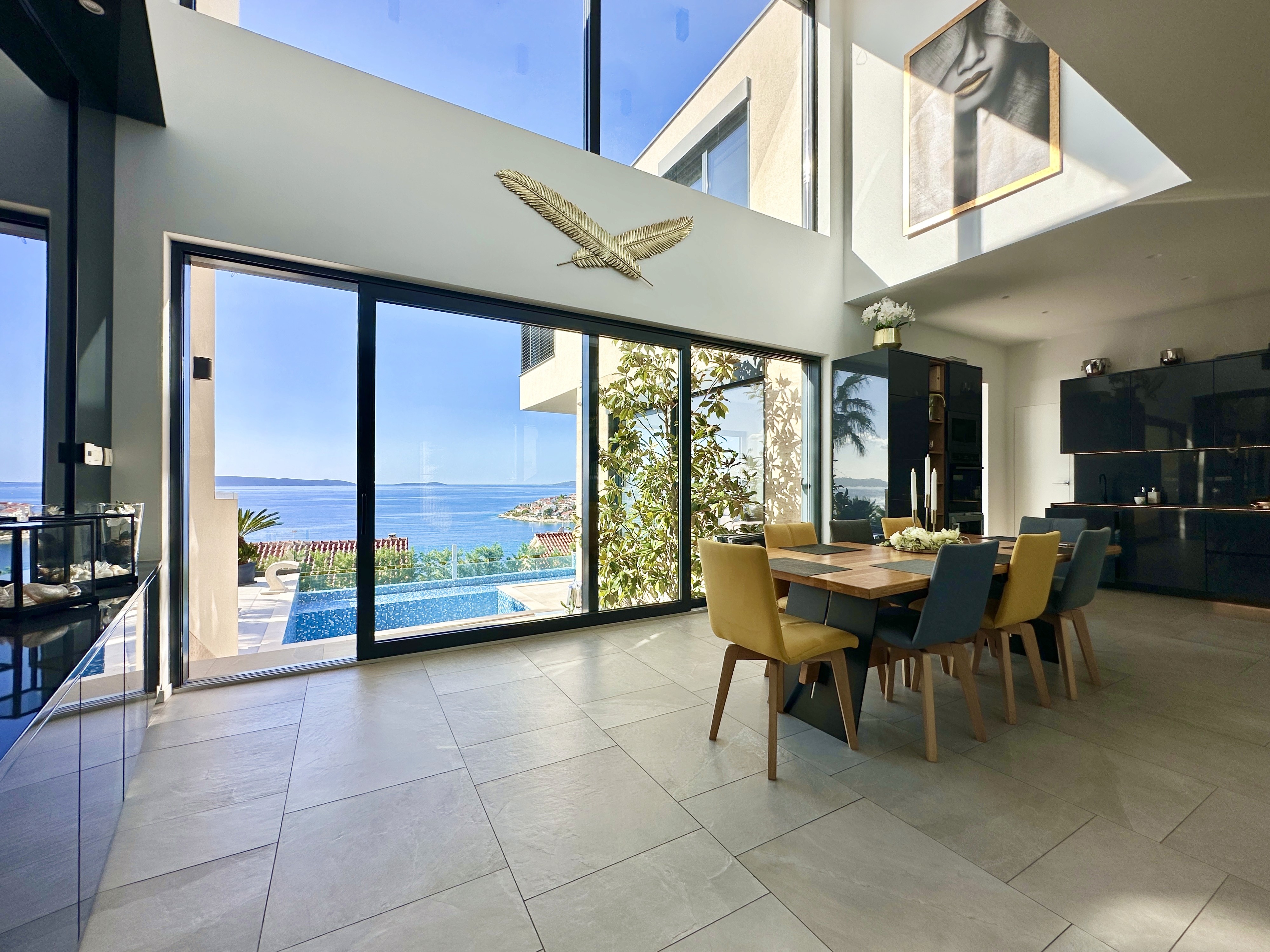 Welcome to one of the most extraordinary properties on the sun-kissed island of Čiovo—this exceptional Villa Black Pearl blends timeless elegance, modern comfort, and breathtaking sea views. Spanning 300 m² across three thoughtfully designed levels, every aspect of this home has been crafted for those who seek a luxurious lifestyle infused with serenity and sophistication. Starting with the basement level, you'll discover a dedicated wellness haven designed for ultimate relaxation and rejuvenation. This space includes a combined area with a sauna, gym equipment, a jacuzzi room, a beauty room, one bathroom, and a practical laundry room—perfect for indulging in self-care without leaving the comfort of home. Ample storage and parking places ensure convenience for everyday living. The ground floor, serving as the heart of the villa, features a fully equipped kitchen seamlessly flowing into a spacious dining area, ideal for gourmet meals and family gatherings. Adjacent is a generous living room that invites relaxed evenings, all wrapped in underfloor heating for year-round coziness. A bedroom with its own en-suite bathroom provides private quarters, while direct access to the outdoors enhances the indoor-outdoor flow. The first floor elevates luxury with three additional spacious bedrooms, each boasting its own luxurious en-suite bathroom for maximum privacy and comfort. Expansive terraces here capture panoramic sea views, offering the perfect perch for morning coffees or sunset aperitifs overlooking the Adriatic. Outside, the villa shines with a stunning outdoor swimming pool, surrounded by sun-drenched spaces that invite leisurely swims and al fresco entertaining. South-facing orientation bathes the entire property in natural light, while the meticulously landscaped grounds and sea views create an idyllic backdrop for family living or as a premier holiday retreat. This villa isn’t just a property; it’s a pearl of the Adriatic. A sanctuary of indulgence. A place where elegance meets the endless horizon, offering the ultimate in coastal luxury. Perfectly positioned in the serene beauty of Okrug Gornji on Čiovo, this home is for those who crave a life of unparalleled sophistication.